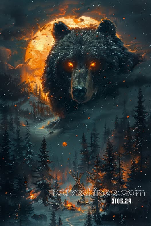 This canvas portrays a Native American woman standing on a sun-drenched mesa at midday, her face painted with tribal symbols and her robe adorned with intricate coyote fur patterns and beads that gleam in the golden light. She plays a flute, its melody rising with the warm breeze, as a coyote trots playfully across the arid landscape below, its form outlined against a vibrant blue sky with scattered clouds. The terrain features golden sands, scattered cacti, and a distant dry riverbed reflecting the sun’s rays, framed by rugged mesas. The interplay of light and shadow highlights the texture of her attire, the coyote’s sleek fur, and the sun-warmed earth, creating a lively and spiritual atmosphere. A hawk circles overhead, adding a sense of freedom, while lizards scurry in the distance, enhancing the desert’s vitality. Her serene expression reflects a deep connection to the land, as if her song celebrates the coyote’s spirit. This artwork captures a moment of unity with nature’s midday splendor, evoking joy and the woman’s bond with the sunlit desert. The detailed composition invites viewers to feel the uplifting tune and the coyote’s spirited presence under the sun’s watchful gaze.