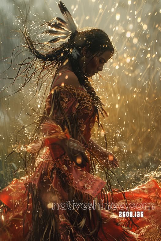 This canvas portrays a Native American woman standing on a sunlit hill at midday, her face painted with tribal symbols and her robe adorned with intricate elk motifs and feather accents that shimmer in the golden light. She plays a flute, its melody rising with the warm breeze, as an elk grazes gracefully on the lush plains below, its antlers catching the sun’s rays against a vibrant blue sky with scattered clouds. The landscape features rolling hills covered in wildflowers, a sparkling stream winding through the valley, and distant mountains bathed in sunlight. The interplay of light and shadow highlights the texture of her attire, the elk’s sleek fur, and the vibrant grass, creating a lively and spiritual atmosphere. Deer roam in the distance, adding life to the scene, while birds soar overhead, enhancing the sense of freedom. Her serene expression reflects a deep connection to the land, as if her song celebrates the elk’s majesty. This artwork captures a moment of unity with nature’s midday splendor, evoking joy and the woman’s bond with the sunlit wilderness. The detailed composition invites viewers to feel the uplifting tune and the elk’s quiet grace.