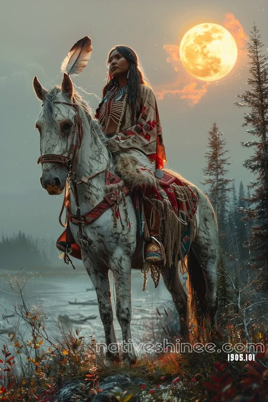 This canvas portrays a Native American woman standing on a sunlit plateau at midday, her face painted with tribal symbols and her robe adorned with intricate raven feather patterns and beads that gleam in the golden light. She plays a flute, its melody rising with the warm breeze, as a raven soars overhead, its wings cutting through a vibrant blue sky dotted with fluffy clouds. The landscape features a vast desert expanse with scattered cacti, a dry riverbed, and distant mesas bathed in sunlight, creating a lively and spiritual scene. The interplay of light and shadow highlights the texture of her attire, the raven’s sleek feathers, and the sun-warmed earth, evoking a radiant and sacred atmosphere. A coyote pauses in the distance, adding life to the arid wilderness, while birds flit across the horizon, enhancing the sense of freedom. Her serene expression reflects a deep connection to the land, as if her song celebrates the raven’s spirit. This artwork captures a moment of unity with nature’s midday glory, inspiring joy and the woman’s bond with the sunlit desert. The detailed composition invites viewers to feel the uplifting tune and the raven’s graceful flight.