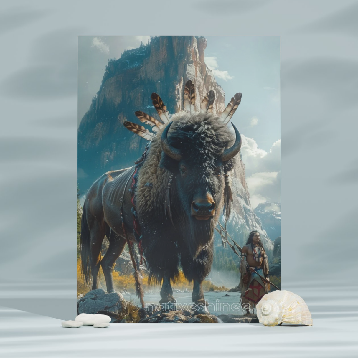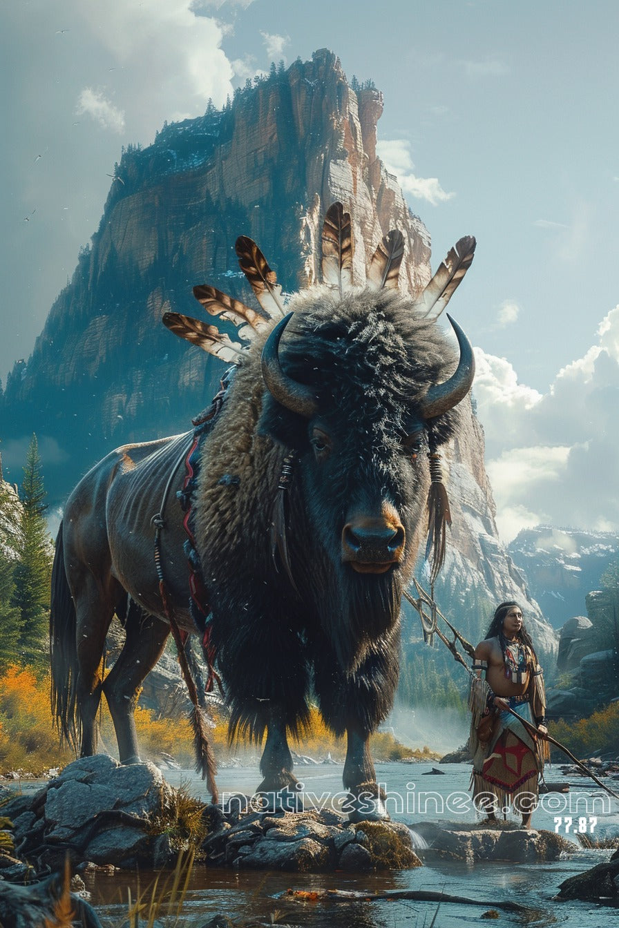 Immerse yourself in the beauty and strength of this breathtaking canvas. The "Spirit of Endurance" features a majestic, fluffy buffalo adorned with beautiful feathers on its head, standing proudly in a stream. Beside the buffalo stands a Native American figure, holding a spear with a quiet strength and wisdom. Behind them rise towering, rocky mountains, their grandeur softened by the warm, inviting colors of the scene. The buffalo exudes power and pride, while the figure beside it embodies bravery and resilience. The peaceful, magical atmosphere of the image creates a sense of timeless harmony, as if capturing a moment suspended in time. This canvas honors the enduring spirit of the land, its people, and the bond between them.