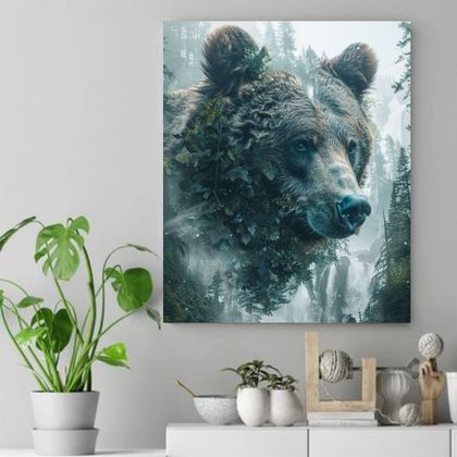 The powerful visage of a grizzly bear merges seamlessly with the lush wilderness, embodying the spirit of nature's protector. A cascading waterfall flows behind, its mist intertwining with the foliage, creating an ethereal connection between the elements. Below, a group of riders crosses the terrain, their journey dwarfed by the immense presence of the bear—a symbol of strength, wisdom, and the untamed spirit of the land. This imagery captures the harmonious coexistence of man, beast, and the natural world.
