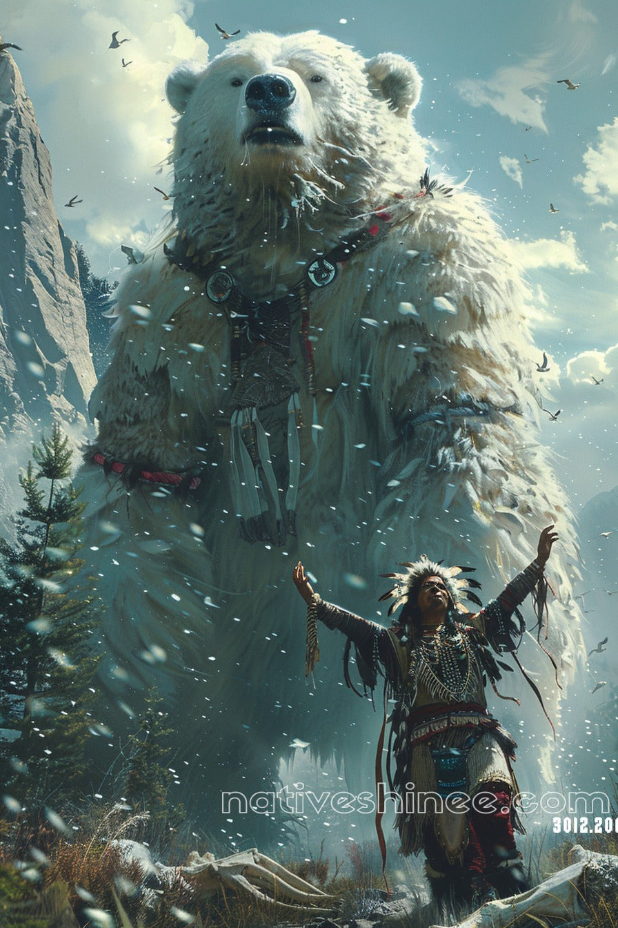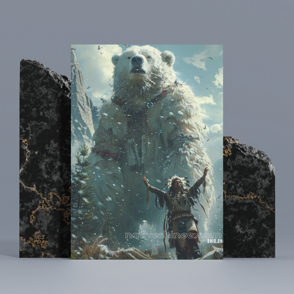 A majestic polar bear, towering against a dramatic sky, stands as a symbol of power and strength. A Native American figure, adorned in traditional attire, gazes up in reverence, acknowledging the spirit and wisdom of the creature. "Spirit of the Bear" Native American Canvas.
