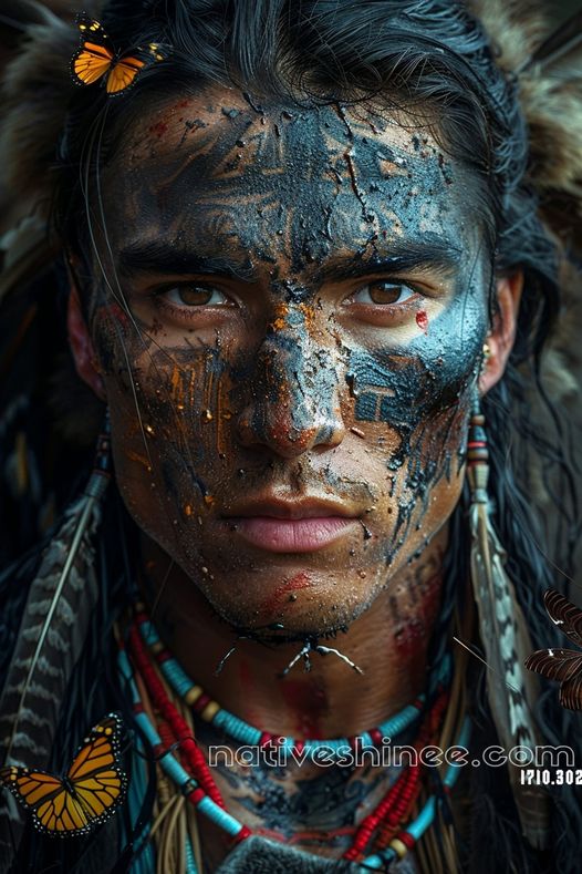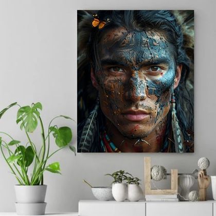 This striking canvas captures the powerful gaze of a young Native American warrior, his face adorned with earthy paint that resembles the rich textures of soil and stone. Each brushstroke reflects his connection to the earth, embodying resilience and pride. Monarch butterflies flutter around him, symbolizing transformation and the enduring spirit of his people. The intricate beadwork and feathers woven into his attire tell stories of heritage and strength. This artwork brings the viewer face-to-face with a legacy of courage and reverence for nature, making it a compelling piece for those who honor Indigenous culture and the beauty of the natural world.