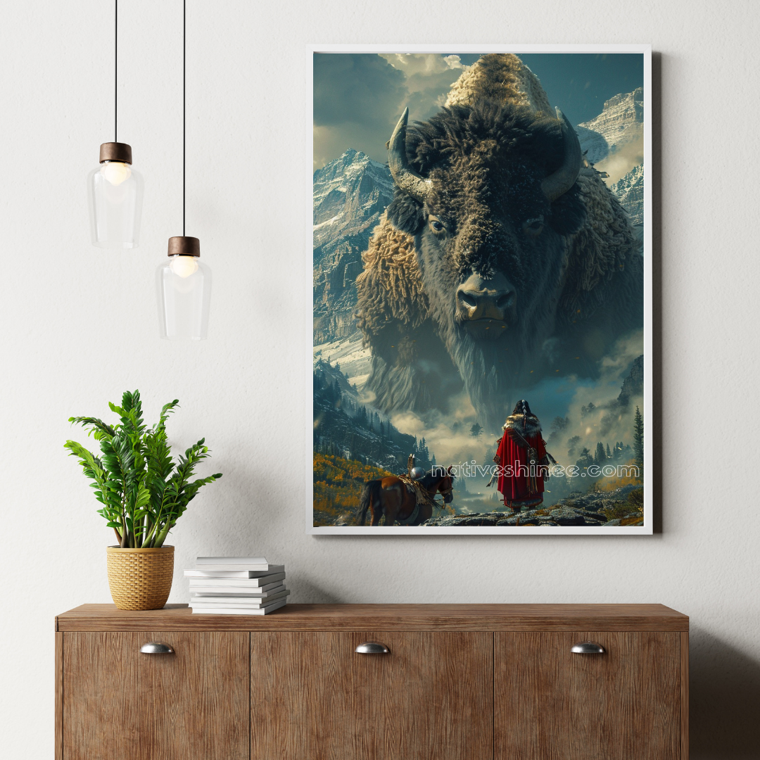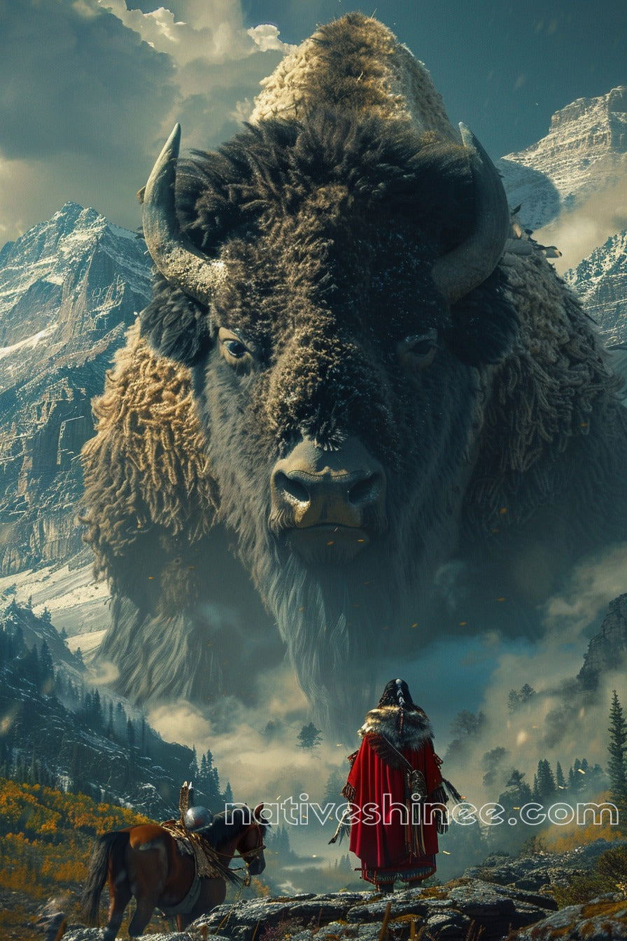 A lone Cheyenne warrior stands before the towering presence of a colossal bison, its eyes filled with ancient wisdom and power. Cloaked in a ceremonial red robe lined with fur, the warrior gazes in awe at the manifestation of the Great Spirit. The misty mountains loom in the background, their peaks shrouded in clouds, while golden autumn forests stretch below, untouched and sacred. This is not merely an animal but a guardian, a force of nature, a symbol of survival and the bond between the Cheyenne people and the land they call home