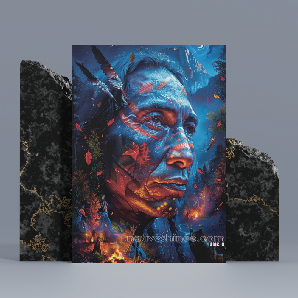 This captivating canvas art portrays the powerful and mystical presence of a Native American figure, their face painted with vibrant, colorful designs that blend seamlessly into the surrounding natural elements. The intricate patterns on the warrior’s face tell a story of connection with the earth, the animals, and the universe. In the background, the glow of campfires and teepees reflects a sense of community and tradition, while a lone wolf roams, symbolizing the deep spiritual bond shared between the people and the animal world. The dark sky and swirling colors of the night sky invoke the mystery and reverence for the sacred forces at play in Native American culture.