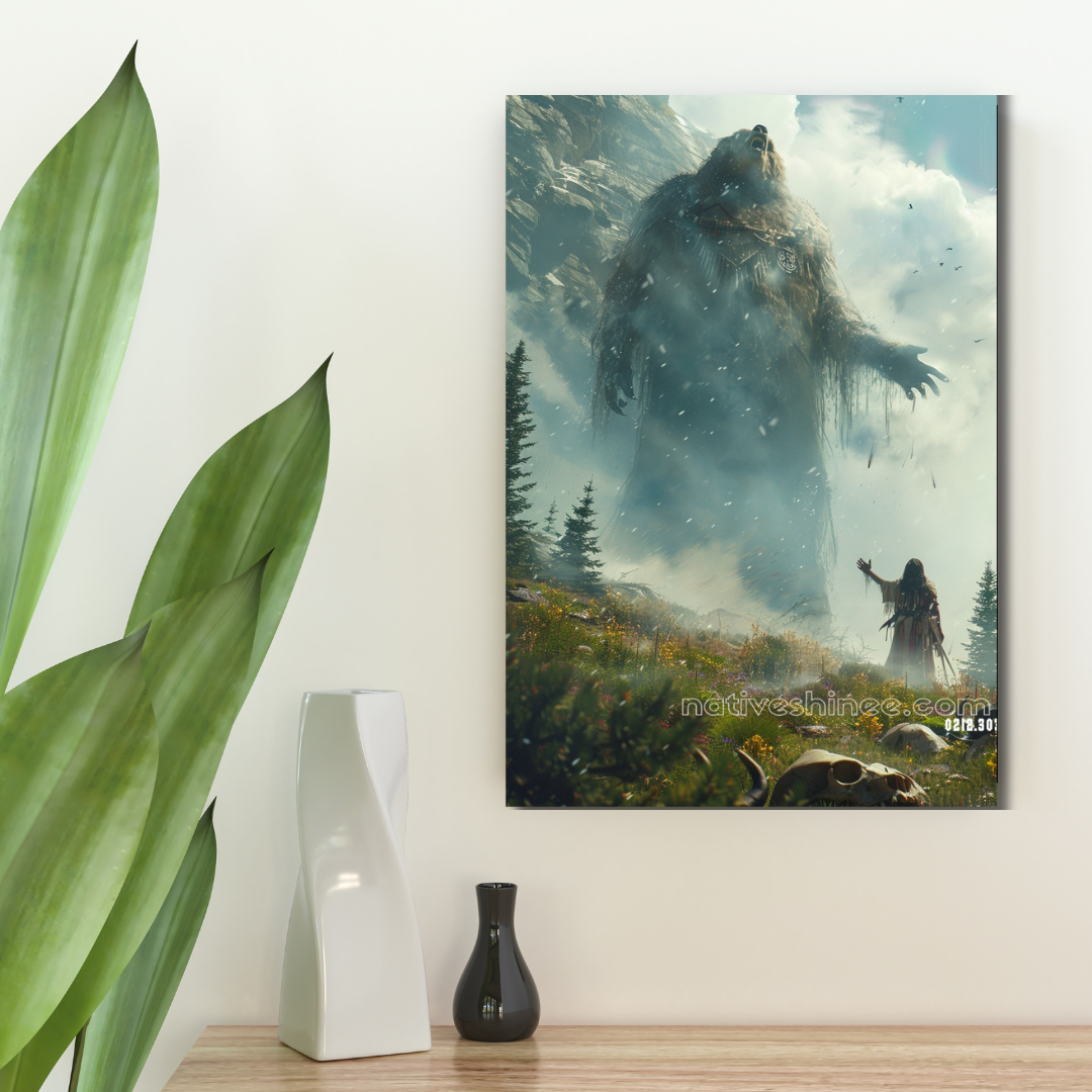 A powerful vision unfolds amidst misty mountain peaks as a towering spirit bear, adorned with ancient tribal markings, emerges from the clouds. Below, a shaman stands in reverence, arms raised in communion with the colossal guardian, summoning its protection and wisdom. The scene speaks of harmony between human and nature, embodying the sacred connection to ancestral spirits. A breathtaking tribute to tradition and belief, captured in this Native American Canvas.