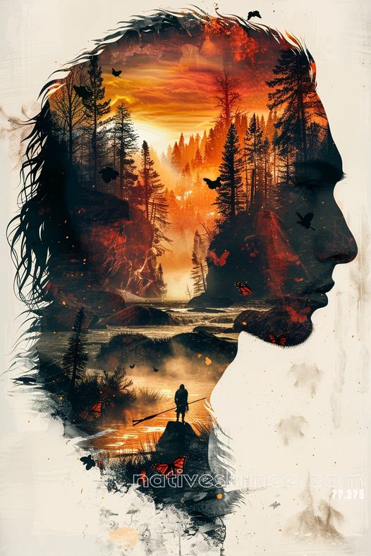 Immerse yourself in the harmony of nature and human spirit with this captivating double exposure canvas artwork. The profile silhouette of a Native figure is interwoven with a vivid landscape scene, where a sunset blazes through a dense forest, highlighting the river below. Birds and butterflies add life and movement, symbolizing freedom and transformation. This art piece beautifully captures the essence of the wild and the deep connection Native Americans hold with the land, inviting reflection on the unity between humanity and the natural world. A stunning addition to any space that celebrates culture and tranquility.