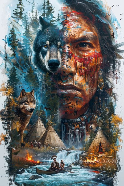 This captivating canvas art weaves the soul of the Native American warrior with the untamed spirit of the wolf. A powerful portrait of a warrior, adorned with vibrant face paint, is seamlessly blended with the fierce gaze of a wolf, symbolizing resilience and unity with nature. Surrounding the central figure are scenes of tribal life, teepees, and canoes on a river, all underscored by the wilderness of towering trees and waterfalls. The imagery captures the harmony between humans and nature, the strength of the wolf as a spirit guide, and the deep cultural significance of Native American heritage. Perfect for anyone who appreciates art that conveys spiritual depth and ancestral power.