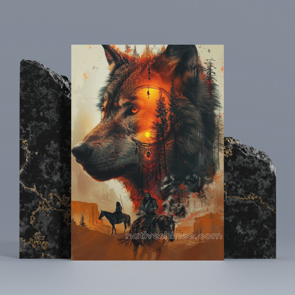 This captivating canvas illustrates the deep spiritual bond between Native American cultures and the wolf. The majestic wolf’s face, glowing with the warmth of the setting sun, embodies both the power and mystery of the wild. With the dreamcatcher symbolizing the sacred connection between the natural world and the spirit realm, this piece brings forth themes of guidance, protection, and resilience. A striking representation of the animal spirit guides and the strength of the Native American way of life.