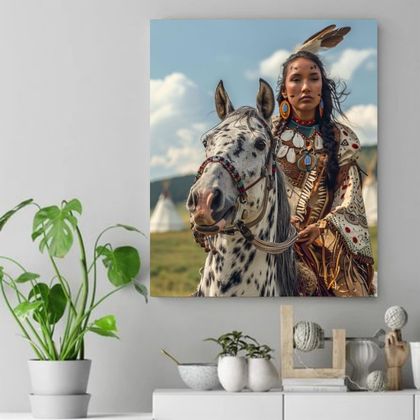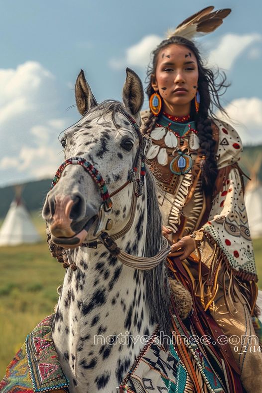A proud Native American woman sits gracefully atop a stunning dappled horse, exuding strength and dignity. Her intricate ceremonial attire, adorned with feathers, beads, and detailed embroidery, reflects the rich cultural heritage of her people. The horse, equally majestic, is draped in vibrant patterns that complement its rider's regalia. In the background, teepees dot the sunlit prairie, completing the scene of harmony between tradition, nature, and resilience. Her calm gaze and the horse's alert stance symbolize an unbreakable bond with the land and its timeless spirit.