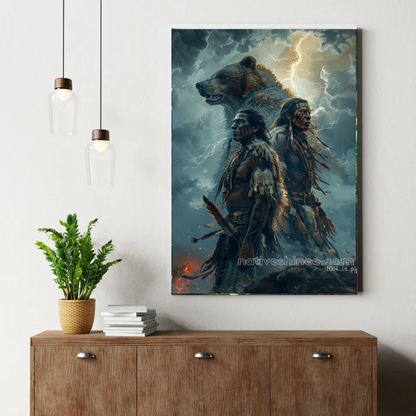 Feel the power of nature and heritage with our Stormy Warriors Canvas! This dramatic canvas print captures two Native American warriors in traditional attire, standing together under a stormy sky illuminated by a lightning strike, with a formidable bear in the background, symbolizing strength and resilience. Perfect for those who admire cultural heritage and the raw energy of nature, this artwork adds a bold and intense touch to any space. Printed on high-quality canvas, it delivers vivid colors and intricate details, ensuring a lasting and impactful display. Ideal for hanging in your living room, office, or study, this canvas print brings the fierce spirit of Native warriors and the might of a thunderstorm into your home, making it a captivating focal point for your decor.