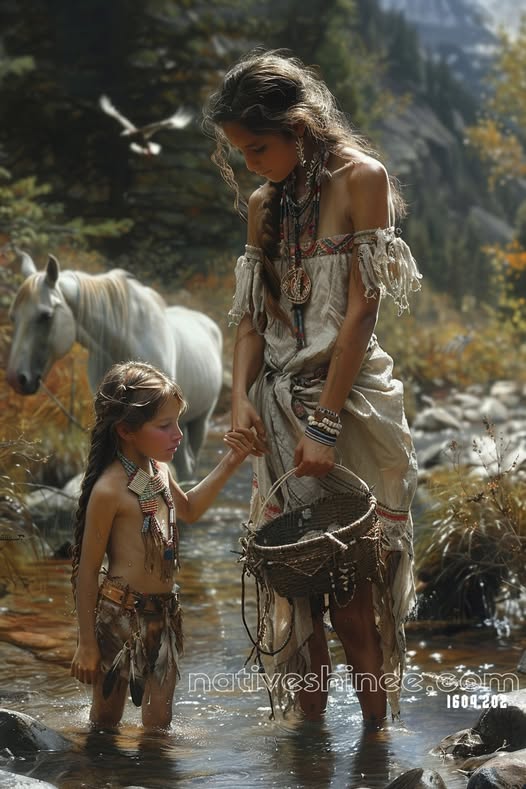 The canvas portrays a gentle and intimate moment of familial bond by a serene mountain stream, where a young woman in traditional, flowing attire adorned with beads and fringes holds the hand of a small child, guiding them through shallow waters. The child, similarly dressed with simple feathers and trinkets, carries a woven basket brimming with gathered items, their innocent expression filled with wonder. A majestic white horse stands nearby, grazing peacefully, while a bird soars overhead against a backdrop of lush autumn foliage, rocky banks, and distant snow-capped peaks shrouded in mist. The warm, dappled light filtering through the trees enhances the sense of nurturing and harmony with nature. The artwork is framed and displayed above a wooden cabinet, accompanied by a green plant and a stack of books, creating a warm and natural ambiance in the setting.