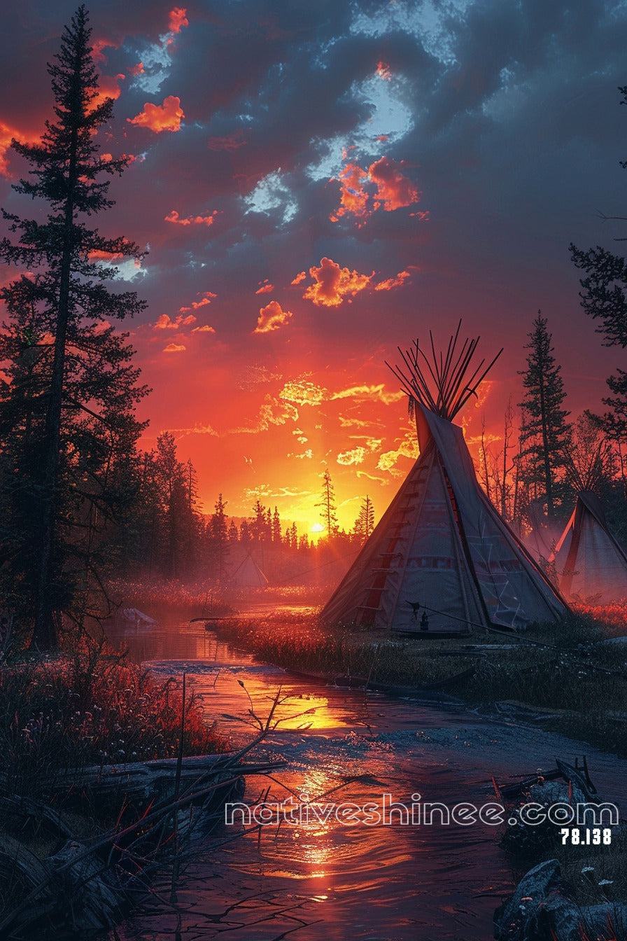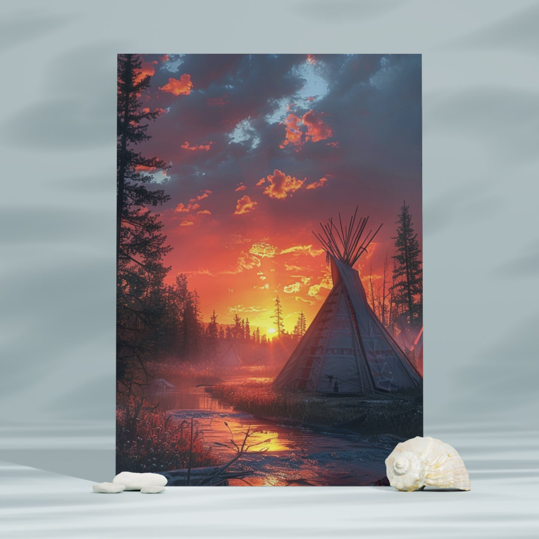 This stunning canvas captures the serene beauty of the Canadian wilderness at sunset. In the foreground, an Indigenous tipi stands proudly, set against a tranquil landscape where the sky's rich colors—reds, oranges, yellows, and blues—are mirrored in the calm waters. The clouds reflect the vibrant hues, creating a harmonious and peaceful scene. The realistic style and meticulous textures bring every element to life, from the detailed tipi to the natural surroundings, evoking a deep connection to the land. The overall composition, with its vivid colors and atmospheric depth, beautifully conveys the essence of nature's evening glow.