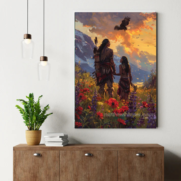 Step into a world of serenity and tradition with our Sunset Journey Canvas! This breathtaking canvas print captures two Native American figures in traditional attire, walking hand-in-hand through a vibrant field of wildflowers at sunset, with majestic mountains in the background, an eagle soaring above, and a flock of birds dotting the sky. Perfect for those who cherish cultural heritage and the tranquil beauty of nature, this artwork adds a touch of peaceful elegance to any space. Printed on high-quality canvas, it showcases vivid colors and intricate details, ensuring a lasting and impactful display. Ideal for hanging in your living room, bedroom, or office, this canvas print brings the harmonious spirit of a Native-inspired sunset journey into your home, making it a captivating focal point for your decor.