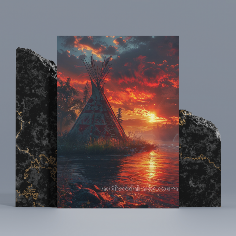 This breathtaking piece captures the glowing warmth of the sun as it sets over the plains, illuminating a teepee that stands proudly at the water's edge. The river reflects the golden hues, mirroring the peaceful serenity that blankets the land. With every brushstroke, the canvas speaks of ancestral lands and the harmonious coexistence with nature. This artwork is a tribute to the deep spiritual connection between Native American culture and the earth, evoking feelings of peace, pride, and belonging.