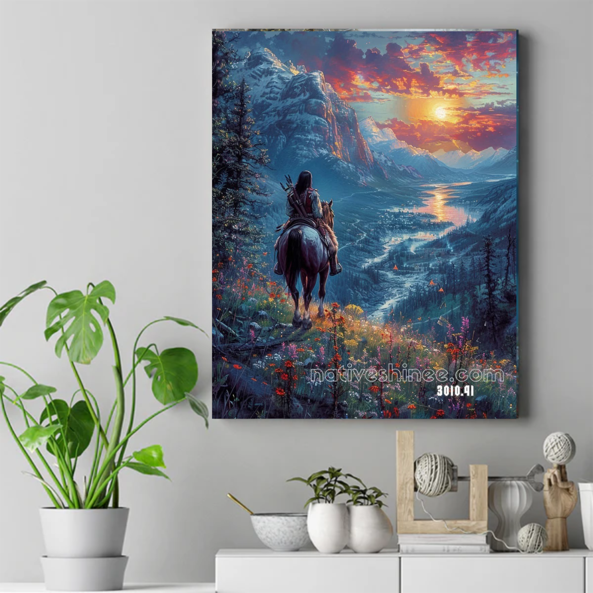 Sunset Over the Warrior’s Journey is a serene yet powerful portrayal of a lone Native rider pausing on a cliff as the sun melts into a glowing valley below. Surrounded by wildflowers and towering peaks, the scene captures a moment of reflection, freedom, and quiet resilience. It is a tribute to the spirit of the land and the timeless courage carried along every path a warrior takes.