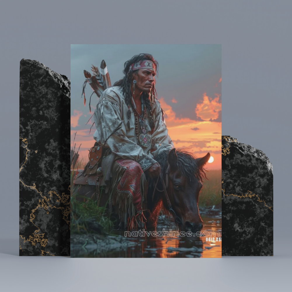 This "Sunset Rider" canvas print captures the powerful image of a Native American warrior on horseback, deep in thought as the sun sets behind him. The warrior, dressed in traditional attire, is adorned with intricate beads and feathers, symbolizing his connection to his heritage. The warm glow of the sunset casts a serene yet commanding presence over the scene, reflecting the warrior's strength and tranquility. This canvas piece is perfect for those who appreciate Native American culture, evoking a sense of power, peace, and the timeless bond between humans and nature.