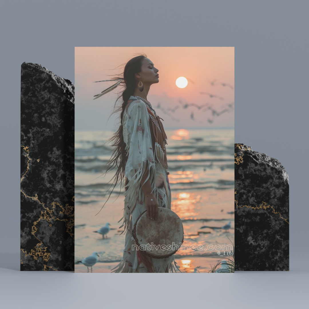 Celebrate the elegance and spiritual connection of this stunning artwork. Featuring a Native woman in traditional attire, standing gracefully by the ocean as the warm glow of the sunset bathes the scene, this piece radiates tranquility and strength. With intricate details of her attire, the delicate drum in her hand, and birds soaring in the distance, this canvas captures the beauty of heritage and the peaceful harmony of nature. A perfect addition to spaces that value culture, inspiration, and serenity.