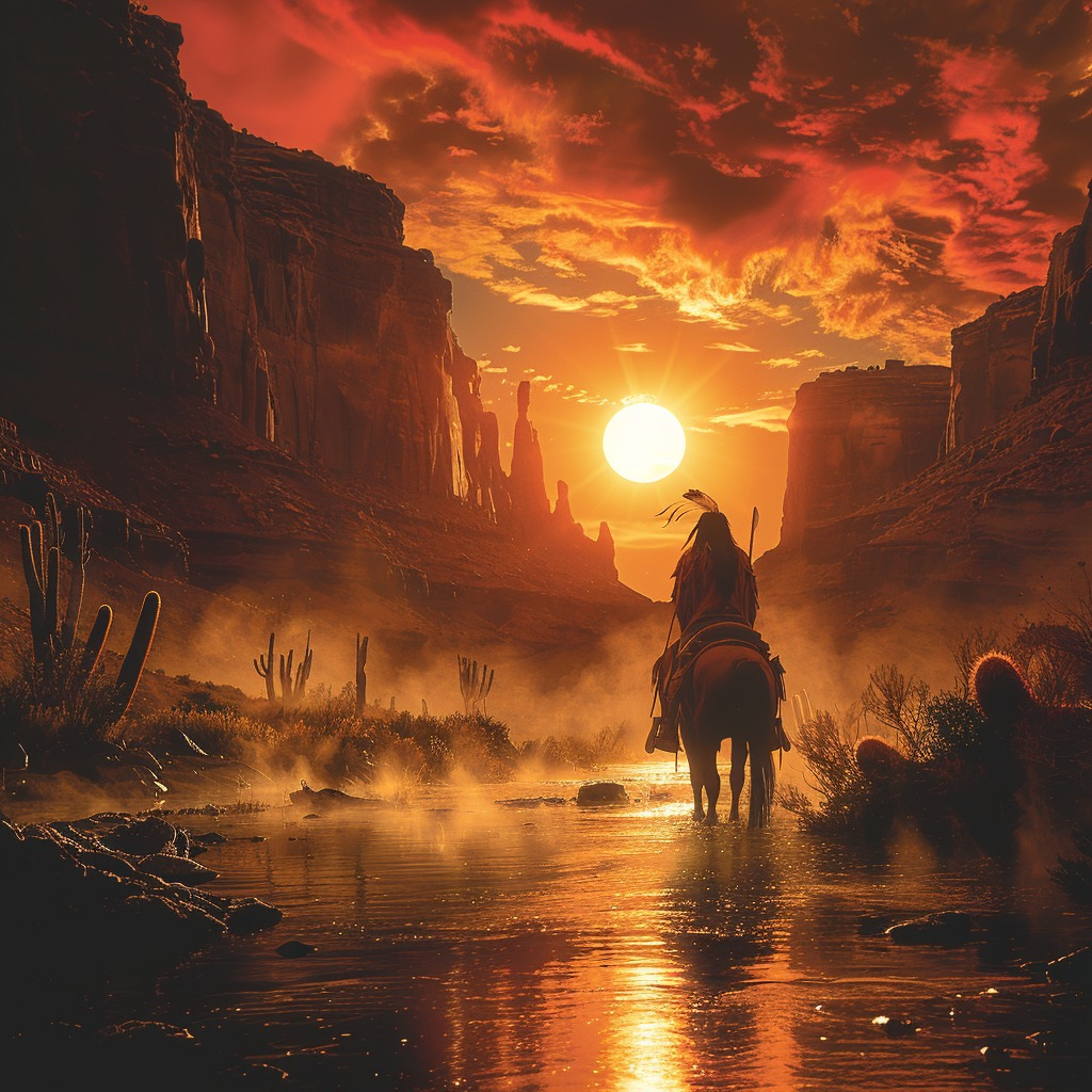 "Riders of the Sunset Symphony: Warrior's Ride to the Melody of Falling Waters" Native American Horse Canvas captures a mesmerizing moment where riders traverse a landscape bathed in the warm hues of a sunset. This Native American Poster portrays a scene of harmony and strength as the warriors, accompanied by their horses, journey to the melody of falling waters. Against the backdrop of nature's symphony, the riders embody resilience and unity, their spirits uplifted by the beauty that surrounds them. As both a Horse Canvas and a Native American Canvas, it celebrates the enduring bond between humanity, horses, and the natural world.