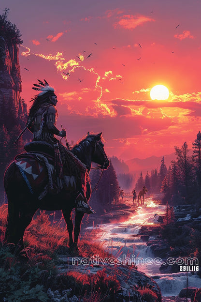 Experience the captivating Sunset Watch Native American Canvas featuring a noble Native American warrior on horseback, overlooking a glowing river under a vibrant sunset sky. The intricate details of traditional attire and the breathtaking natural scenery symbolize strength, connection to the land, and cultural pride. A stunning piece to bring warmth and heritage to your home decor.