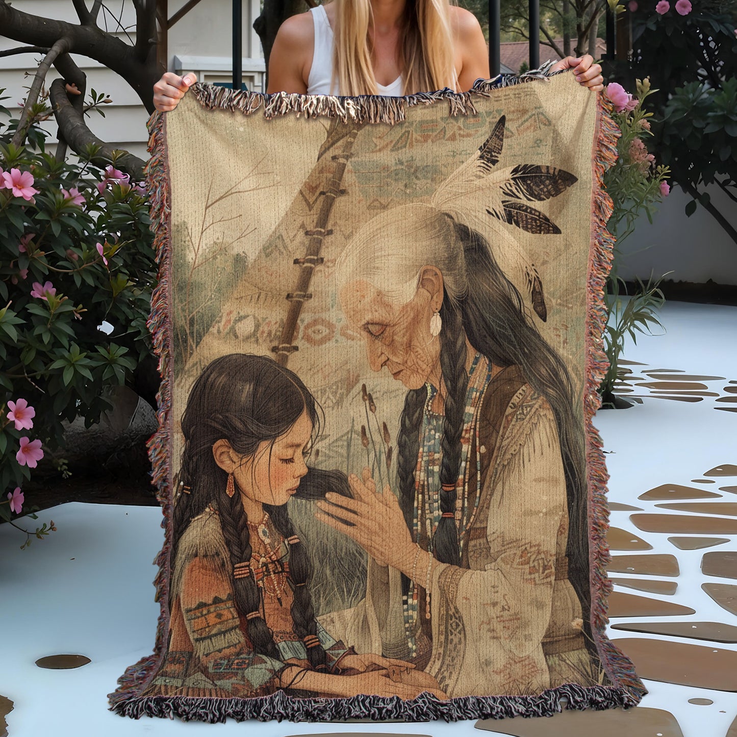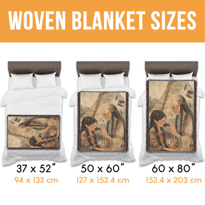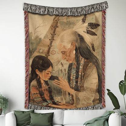 Step into a world of tradition with our 'Teepee Legacy Woven Blanket'! This exquisite throw captures a tender moment between a Native American elder and a child, seated before a teepee adorned with sacred symbols, surrounded by a natural, earthy backdrop. Perfect for those who cherish cultural heritage and the beauty of generational storytelling, this blanket adds a touch of timeless warmth to any space. Crafted from 100% cotton and expertly woven for a soft, breathable, and durable finish, it’s ideal for cozying up on chilly evenings, draping over your couch, or displaying as a striking wall tapestry. The fringed edges enhance its rustic charm, making it a versatile piece for both decor and comfort. Wrap yourself in the rich imagery of this sacred scene, and let its cultural depth inspire your cozy moments.