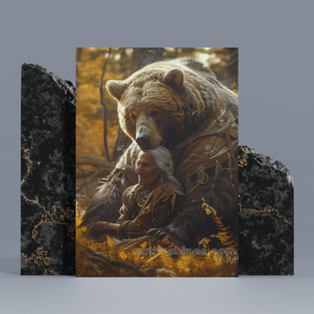 In this breathtaking scene, a Native American woman walks alongside her loyal wolf companion, both journeying toward the majestic mountains that stand as silent guardians of the land. The setting sun casts a warm glow over the serene lake, as the wolf and the warrior share a moment of unity and strength in the wilderness. The peaceful flow of the river reflects the deep connection between the two, as they walk as one with nature. The woman’s ceremonial attire, adorned with intricate beadwork and feathers, symbolizes her cultural heritage and the wisdom passed down from her ancestors. The wolf, often regarded as a symbol of loyalty, courage, and guidance, walks with her as both protector and guide. Together, they are not just part of the natural world—they are intertwined with the very spirit of it. This canvas evokes a sense of reverence for the sacred relationship between humans and animals, and the untamed beauty of the wilderness they call home.