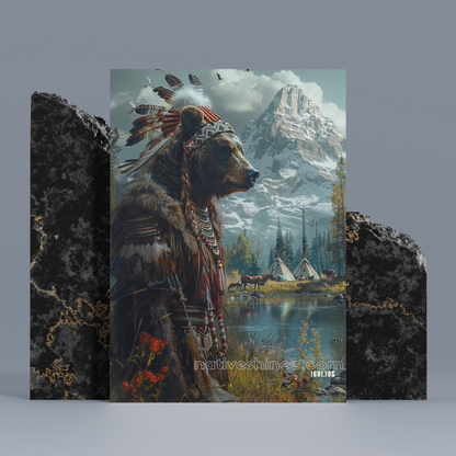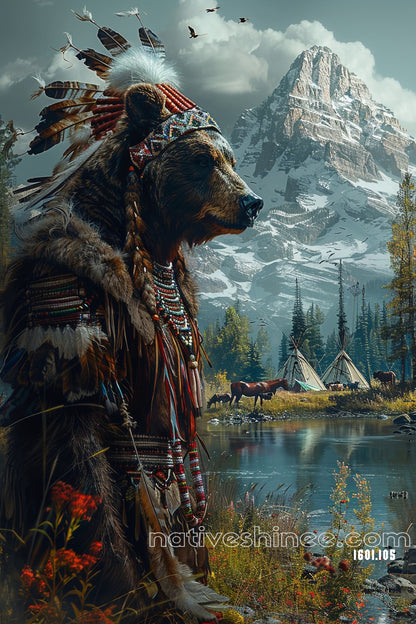 The Bear Chief Native American Canvas captures the essence of power, wisdom, and unity with nature. This majestic artwork features a bear adorned in traditional Native American attire, complete with a feathered headdress and intricate beadwork, standing tall against a breathtaking mountain backdrop. The bear, symbolic of strength and leadership, gazes over a peaceful encampment of tipis and grazing horses, embodying the harmony between man and beast. Set amidst a pristine wilderness, this piece is perfect for those who appreciate the spiritual connection between Native cultures and the wild, celebrating the legacy of animal totems and the deep bond with nature.