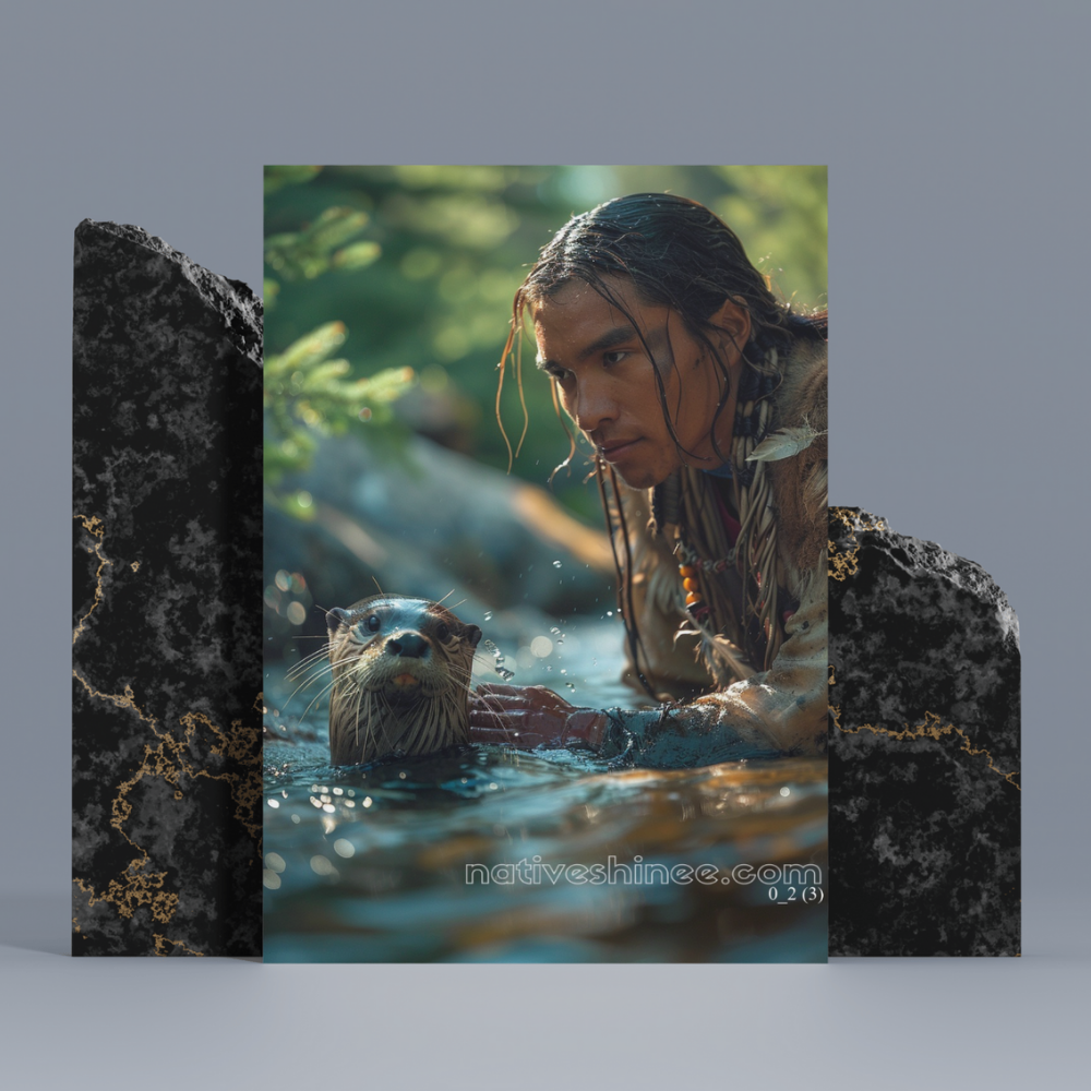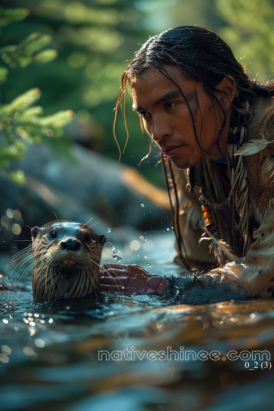 The Bond of the Waters portrays a moment of serene connection between a Native man and a playful otter. Kneeling at the water's edge, his gaze softens as he touches the creature, symbolizing the deep bond between humans and nature. The surrounding green wilderness, bathed in warm sunlight, reflects the tranquility of the moment. With droplets of water glistening in the air, this image captures the harmony of life in its purest form—an intimate exchange between two beings from different worlds, united by the waters.
