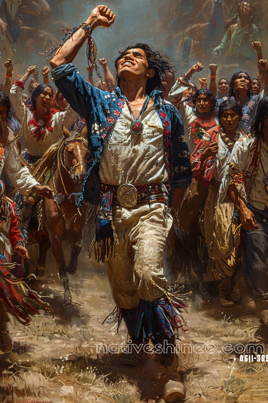 This powerful artwork captures a moment of triumph and defiance as a Native American leader raises his fist in the air, leading a passionate group of warriors. The determination in their faces mirrors the strength and unity of the tribe as they rise together in resistance. The vibrant colors of their traditional attire contrast against the dust and chaos of their surroundings, symbolizing their enduring spirit in the face of oppression. Their movement conveys a sense of unity and solidarity as they march forward, rallying behind the call for freedom and justice.