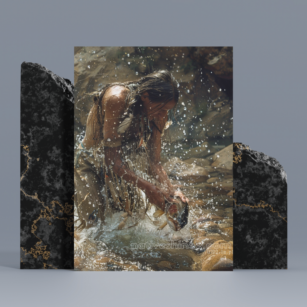 The Catch of Life captures the serene yet powerful moment when a Native American man, immersed in the flowing waters of a river, grasps a fish in his hands. The water splashes around him, sparkling in the sunlight as droplets fly through the air, symbolizing the deep connection between the man and nature. The scene is filled with movement, with every drop of water reflecting the strength and harmony between the man and the natural world around him. Dressed in traditional clothing adorned with feathers, he embodies the enduring spirit of his people and the sacredness of hunting and fishing traditions. Perfect for those who admire the resilience and beauty of indigenous cultures and the raw power of nature