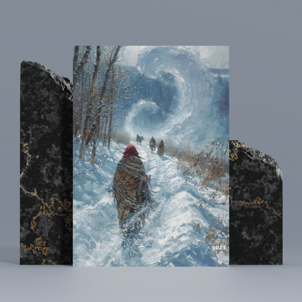 "The Chiefs Journey" captures a poignant moment of strength and perseverance as Native American individuals journey through a snow-covered path. Wrapped in traditional garments, they face the harsh winter landscape with unwavering resolve. The swirling winds in the distance evoke the challenges and resilience they encountered along their journey. This canvas beautifully illustrates the spirit of survival, unity, and the deep connection to the land that defined Native American culture. Perfect for those who admire the strength and enduring spirit of Native American history, this artwork brings depth and reverence to any space.