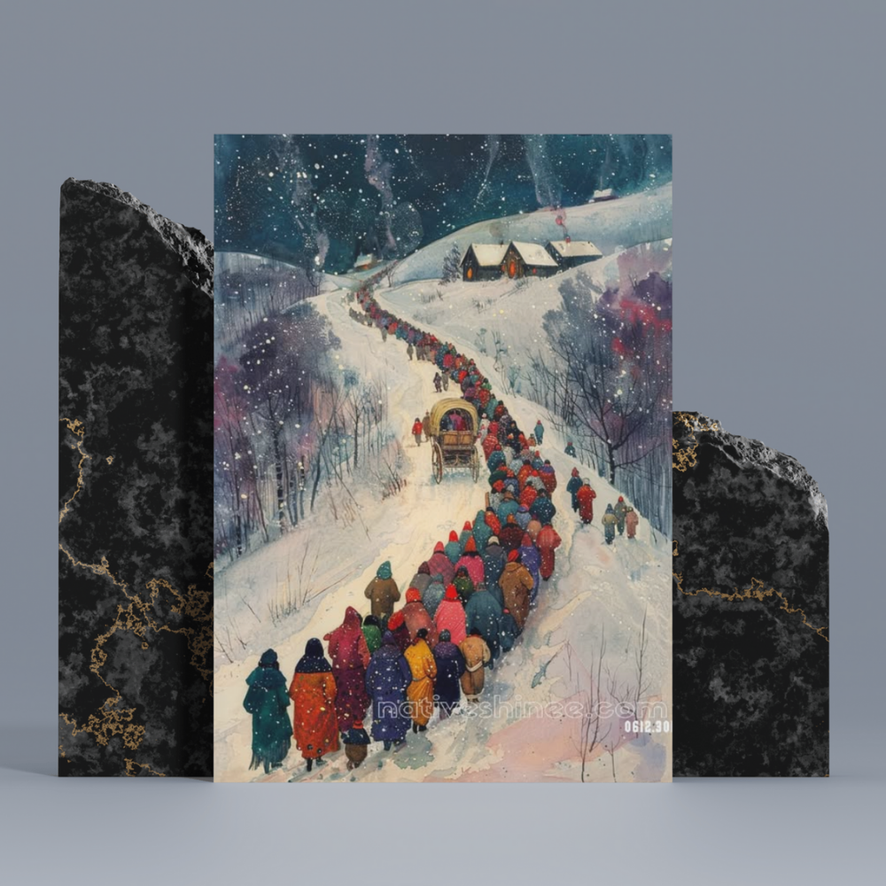 "The Chiefs Journey" depicts a long procession of Native Americans making their way through the snow-covered landscape under a dark, starry sky. Leading the way is a covered wagon, symbolizing the struggle and resilience of the people. The figures are wrapped in vibrant colors, reflecting both unity and the harshness of their journey. The snowy path winds up to distant houses, suggesting both a journey of hardship and hope. This powerful artwork is perfect for those who honor the strength, unity, and perseverance of Native American heritage and its enduring spirit through adversity.