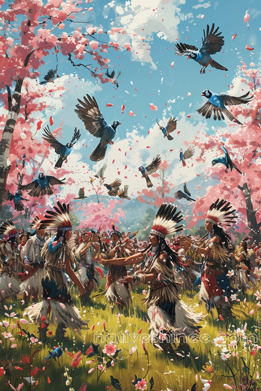 The Dance of Spring captures the vibrant energy of a Native American tribe in the midst of a joyous celebration. Against a stunning backdrop of blossoming cherry trees, vibrant birds flutter above, scattering petals in the wind as the community gathers to dance in unity. The scene is alive with motion and color, symbolizing the renewal and connection to nature that defines the spirit of Native American culture. This artwork encapsulates the beauty of the changing seasons and the harmony between human beings and the earth.