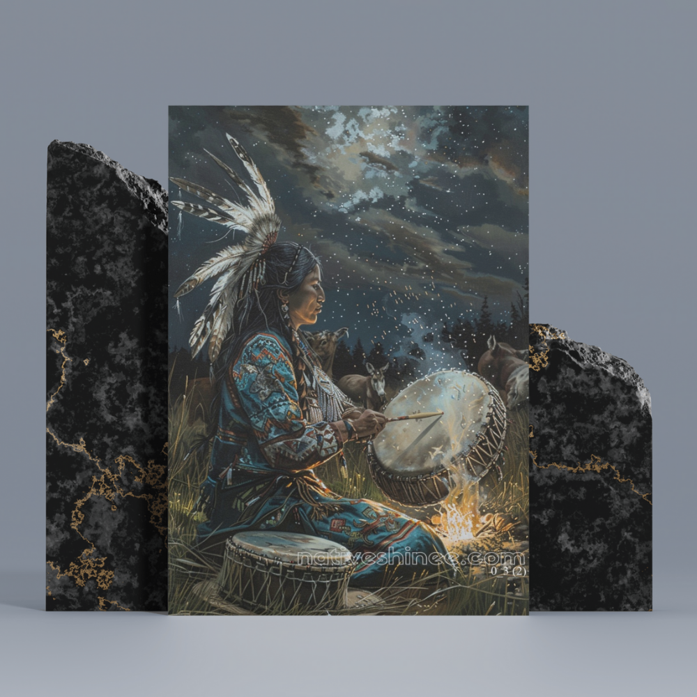 "The Drummer's Ritual" captures the sacred moment of a Native American warrior playing the drum beneath a starry sky. Surrounded by the natural world and accompanied by the animals, the warrior’s rhythmic beats echo through the night, creating a mystical atmosphere. The feathers adorning his head and his detailed attire symbolize his deep connection to his culture and the spiritual realm. Printed on high-quality canvas, this artwork pays tribute to the important role of music and ritual in Native American traditions, making it an inspiring and powerful addition to any space.
