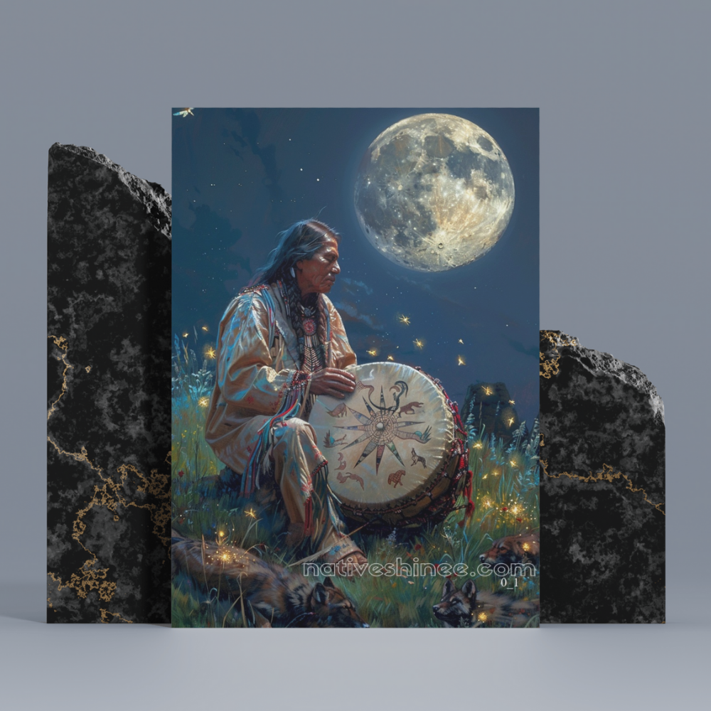 "The Drummer's Moon" beautifully captures a Native American elder playing the drum under the mesmerizing glow of a full moon. Surrounded by the spirits of nature, the elder’s rhythmic drumming creates a deep connection to the earth, reflected in the animals lying peacefully nearby. The intricate details of the drum, adorned with sacred symbols, add to the mystical atmosphere. With the glowing moon above and the stars scattered around, this artwork embodies the spiritual connection between the Native American people and the natural world. Printed on premium canvas, it’s a powerful addition to any collection, celebrating tradition and reverence for life.