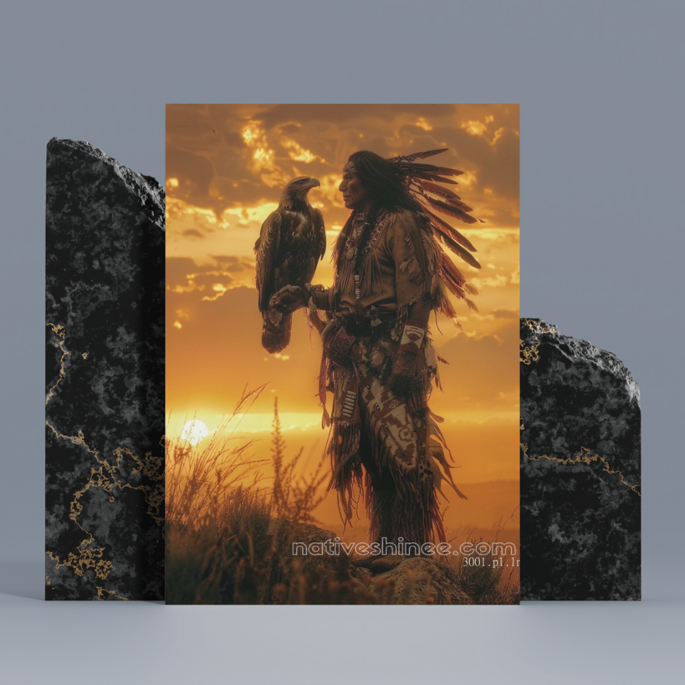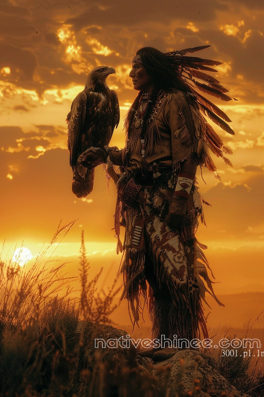 In this powerful and evocative image, a Native American warrior stands with the eagle perched on his arm, the two figures silhouetted against a stunning golden sunset. The sky is ablaze with the colors of the setting sun, and the warrior, adorned in traditional feathers and regalia, gazes at the eagle with a deep and meaningful connection.