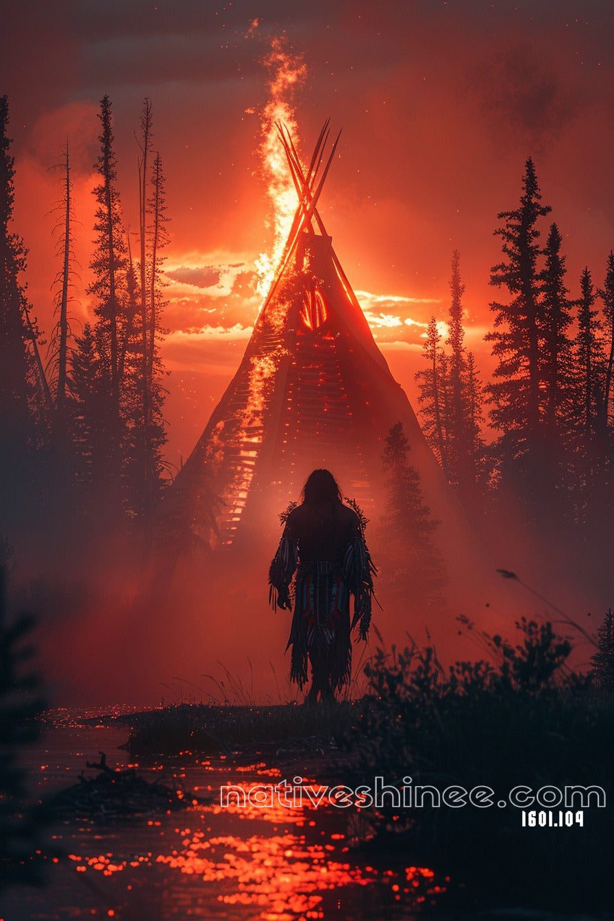 This striking image captures the moment a Native American warrior stands before the sacred fire, an eternal symbol of life and connection to the spirits. The glowing warmth of the fire illuminates the warrior's intricate attire, adorned with feathers and beads, while the tipi in the background radiates with a soft, fiery glow. The warrior, standing tall and resolute, gazes into the flames, embodying the role of protector and guide. The vibrant orange and red hues from the fire reflect upon the ground and the surrounding wilderness, enveloping the scene in a sense of mysticism and ancient power. This piece evokes the spiritual bond between the Native American people and the fire they revered— a beacon of survival, tradition, and strength. The ethereal glow and the sense of calm yet fierce determination within the warrior remind us of the undying connection to nature and the sacred elements that shape their world. This artwork is a powerful representation of honor, bravery, and the spiritual rituals passed down through generations