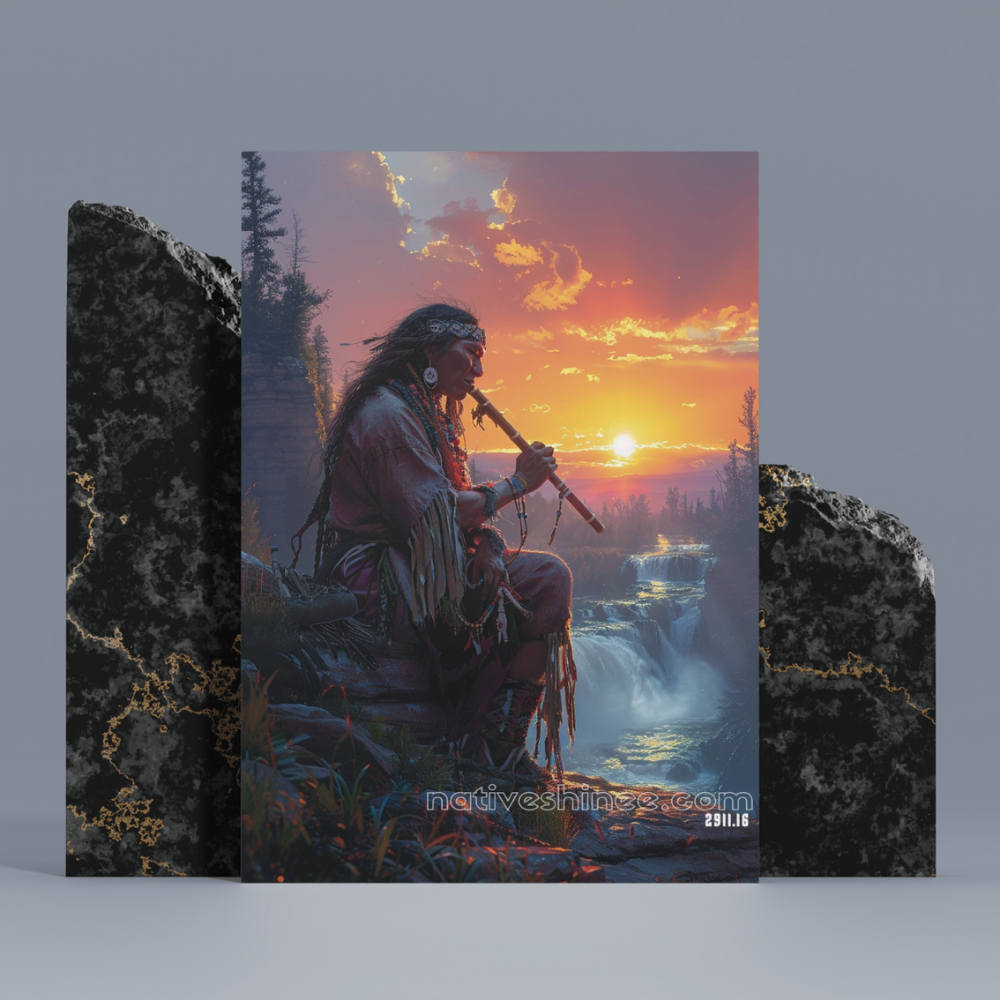 Immerse yourself in the serenity of nature with 'The Flute of the Falls,' a breathtaking fantasy art painting that captures a Native American playing the flute as the sun sets over a cascading waterfall. Set against the backdrop of a tranquil river, the soft light of the sunset reflects off the water’s surface, creating a romantic and cinematic atmosphere. The detailed, ethereal style of this painting perfectly captures the harmony between the musician, nature, and the melody that fills the air. This artwork invites you to relax and reflect, evoking the deep connection between music, water, and the soul.