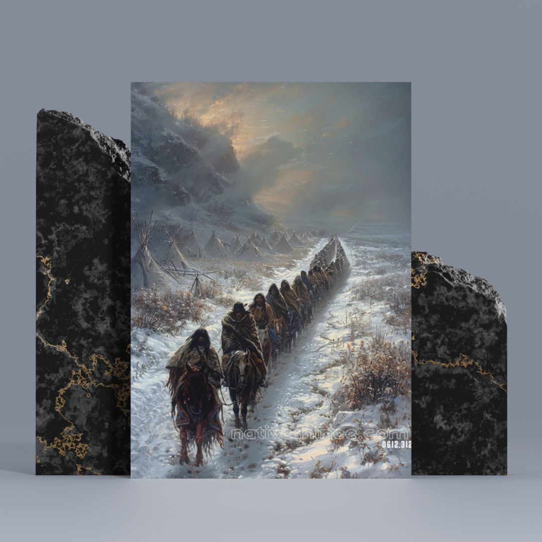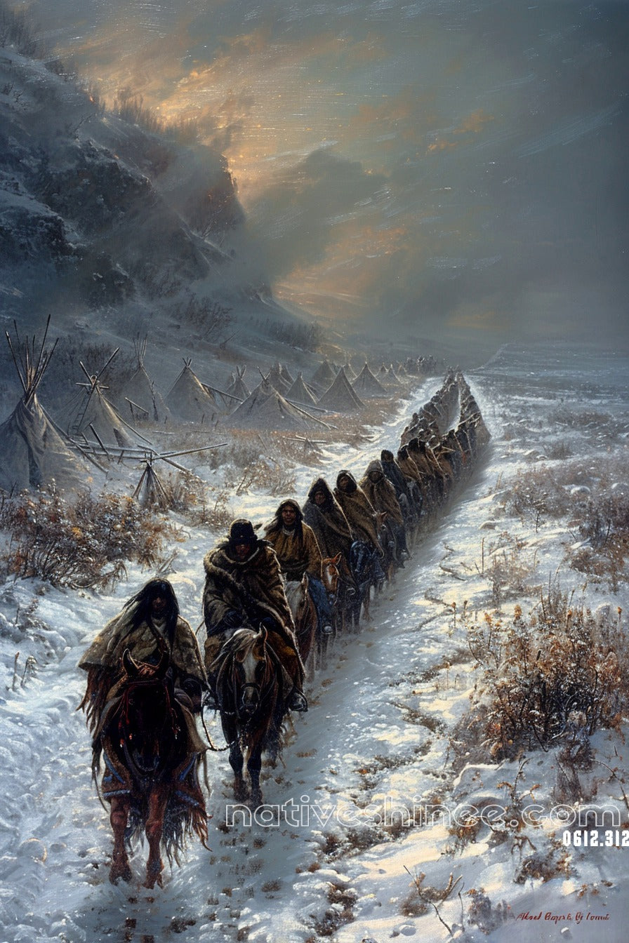 An emotional depiction of a Native American caravan enduring a harsh winter journey. Clad in fur-lined garments, they ride solemnly past a row of tipis under the cold, fading light of day. The rugged mountains and snow-laden landscape symbolize the resilience and perseverance of a displaced people, forced to traverse an unforgiving wilderness. This artwork embodies the poignant story of survival and the enduring spirit of Native American heritage. A compelling Native American Canvas.