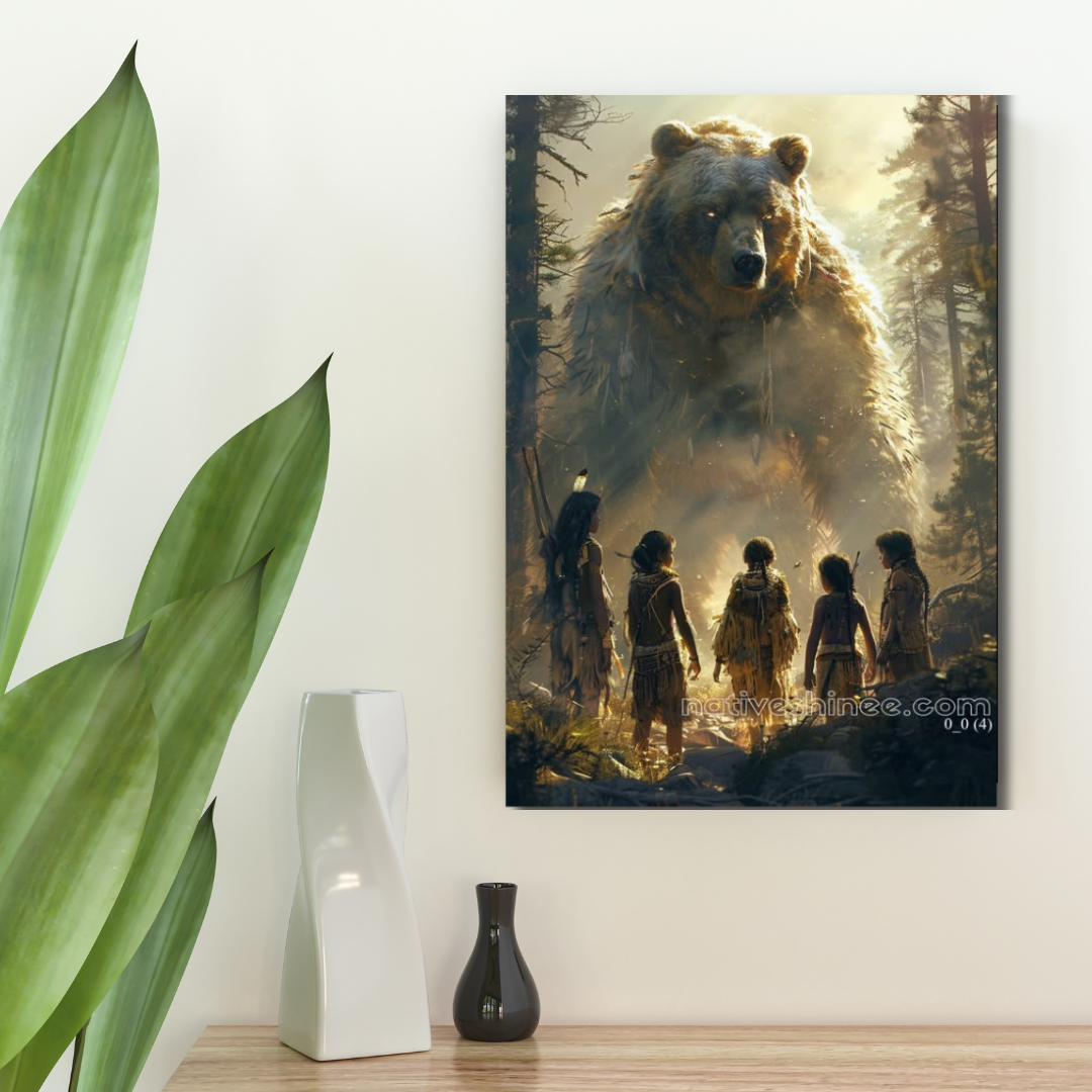 Beneath the ancient canopy of a sacred forest, a mighty bear spirit towers above a circle of young warriors, its presence both awe-inspiring and protective. Bathed in the golden light of a setting sun, this moment captures the harmony between the physical and spiritual realms, as wisdom and courage are passed to the next generation. A testament to unity, tradition, and the guardianship of the land, this is The Guardian's Gathering Native American Canvas.