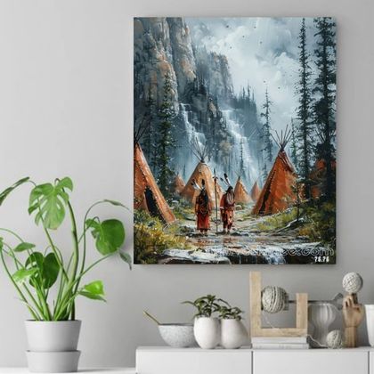 Two Native figures walk side by side through their village of teepees, set against the majestic backdrop of towering cliffs and cascading waterfalls. The misty air and gentle rain add a serene atmosphere as the land itself seems to harmonize with their presence. The vibrant orange of the teepees stands in stark contrast to the grays of the mountains, symbolizing the warmth of community amid nature’s grandeur. Together, they embody the spirit of guardianship and connection to the sacred lands, with every step grounded in respect for the earth and each other.