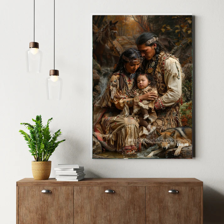 Amid the whispering waters of a forest stream, a young family finds peace in the arms of one another. The mother cradles their sleeping child, her hands gentle yet strong, while the father bows close, his presence a shelter of devotion and protection. Their garments—woven with care and adorned in traditional beadwork—carry the spirit of their ancestors, each thread a reminder of heritage and unity. Nearby, a loyal wolf rests by the stream, symbolizing loyalty, guardianship, and the sacred balance between humankind and nature. The golden hues of autumn frame this tender moment, painting the air with warmth and serenity. Sacred Bonds – The Heart of the Family captures the essence of love that transcends time, the strength that grows from togetherness, and the sacred circle of life. It is a portrait of quiet power, rooted in tradition and the enduring promise of family beneath the watchful eyes of the Earth.