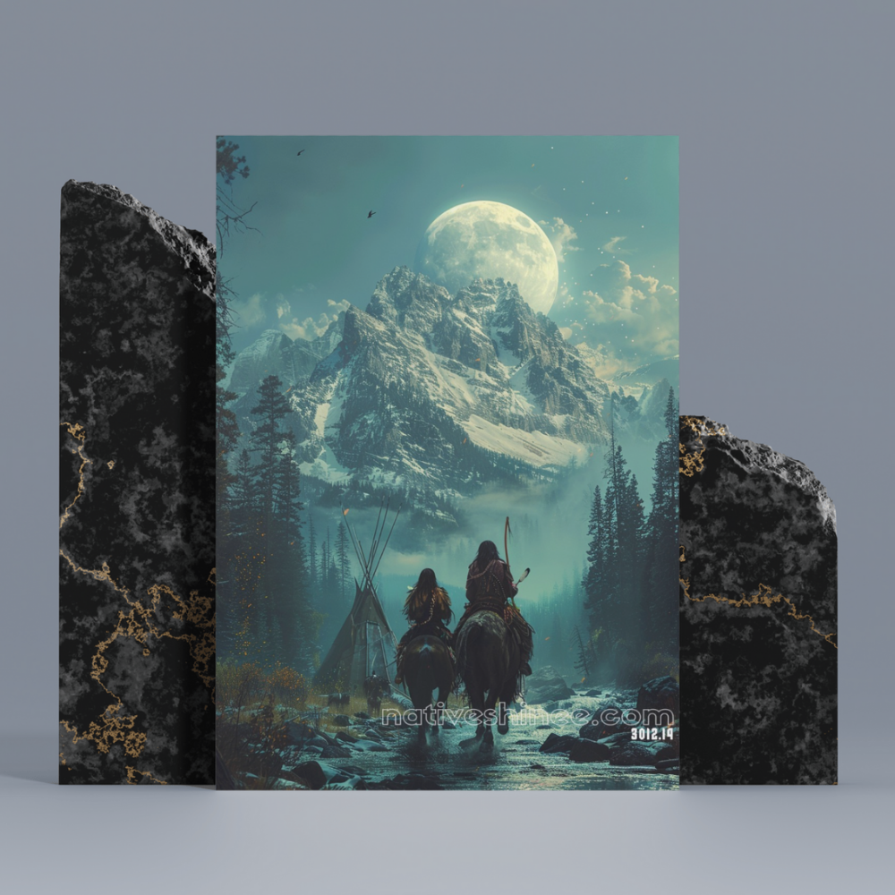 The Journey Beneath the Moon captures a serene yet powerful moment of two riders journeying through a misty valley, with snow-capped mountains towering in the background. The full moon rises high above, casting a mystical glow on the land below. The riders, cloaked in the natural beauty of the wilderness, move with purpose toward their destination, accompanied by the whisper of the wind and the silent strength of the mountains. This image embodies the ancient connection between the land, the moon, and the spirit of the Native people who have long walked this earth.