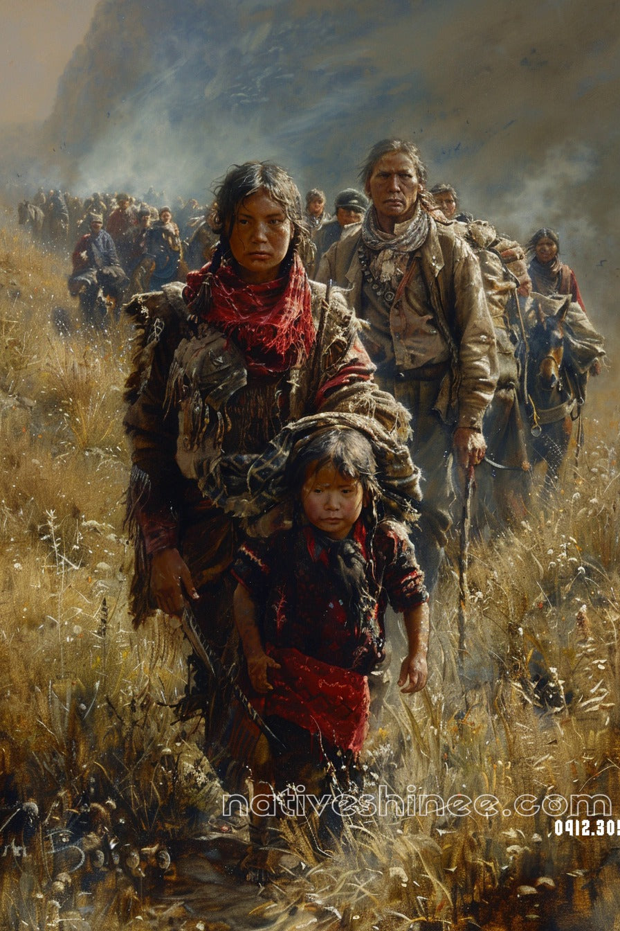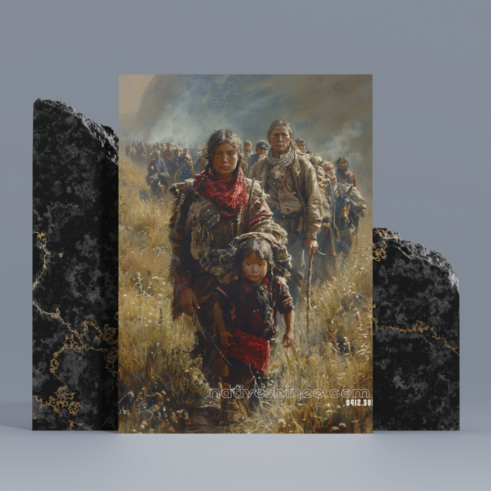 Amidst the golden hues of a parched grassland, a determined mother and child lead a weary procession, their faces etched with strength and resilience. Behind them, families march forward, carrying the weight of their heritage and hopes for a brighter horizon. The smoky backdrop speaks of challenges overcome, while their footsteps echo a story of survival, unity, and an unbreakable connection to their ancestral land. This Native American Canvas is a poignant tribute to the enduring spirit of a people who refuse to be forgotten.