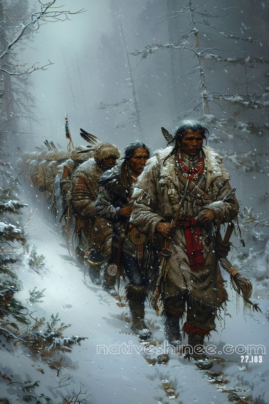 Braving the harsh winter, a group of Native figures marches forward through a snow-covered forest, their faces etched with determination. Wrapped in thick furs and traditional attire, they are united by a shared purpose as they tread a narrow, snow-laden path. The soft snowfall creates an almost ethereal scene, where nature's cold beauty contrasts with the warmth of community and resilience. Each step they take is a testament to their strength, perseverance, and deep connection to the land that shelters them.
