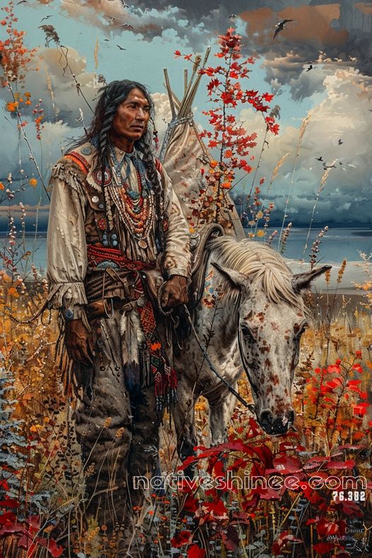 This striking canvas captures a Native American warrior standing proudly with his trusted horse by his side. Surrounded by the vibrant colors of nature, the warrior gazes into the distance, embodying strength and resilience. The intricate details of his traditional attire, adorned with beads and feathers, reflect his cultural heritage, while the dappled horse rests calmly in the serene landscape. The scene speaks of loyalty, honor, and the unbreakable bond between man and nature, creating a visually powerful and emotionally evocative tribute to Native American spirit.