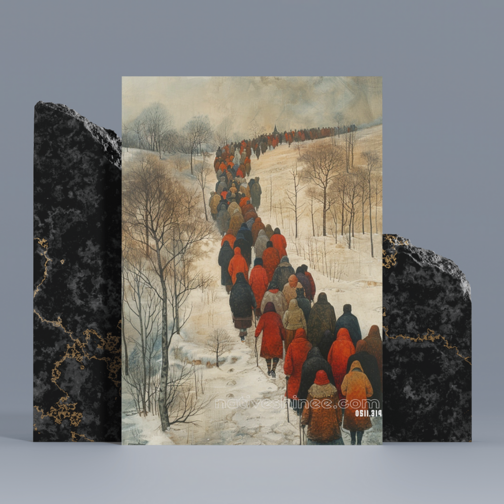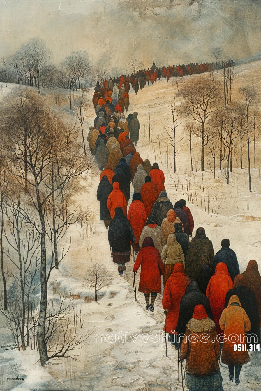 A solemn and moving portrayal of countless figures draped in cloaks of red and earth tones, trekking silently across a snow-blanketed landscape. Each step carries the weight of resilience and survival as they move in unison, disappearing into the mist of an overcast sky. Bare trees stand as silent witnesses to their journey, a testament to endurance and the unyielding spirit of a people bound by shared history and unbreakable determination.
