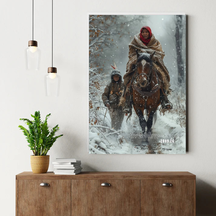 The Path of Survival depicts the enduring spirit of the Native peoples in the harshest of conditions. A weary elder, wrapped in a blanket for warmth, rides on horseback through the relentless snowfall, symbolizing the resilience and wisdom that have guided Native communities through centuries of challenges. The young companion walking beside the horse, bundled in fur and carrying the weight of survival on their shoulders, represents the passing of knowledge and the continuing journey of the younger generation. The falling snow encapsulates the unforgiving environment, yet the pair’s shared purpose and strength cut through the harsh landscape, like a whisper of hope against adversity. This piece speaks to the relationship between generations, the land, and the unbreakable spirit that endures through hardship, always striving to protect and preserve the future.