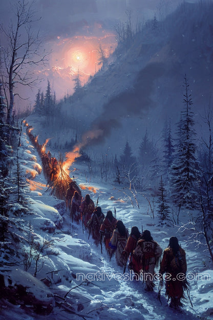 This dramatic image depicts a group of Native American warriors on a cold, snow-covered path, walking in solemn procession. The line of figures is illuminated by the flickering flames of torches, casting a warm, golden glow against the cold winter landscape. The snow crunches underfoot as they move through the forest, their dark silhouettes contrasted against the vibrant hues of a setting or rising sun in the sky. The mountains in the background loom large and majestic, adding a sense of timelessness and grandeur to the scene. Their steps are deliberate, each one marking a powerful journey through the wilderness, their connection to the land and each other strong and unbroken. The quiet intensity of the moment speaks to the endurance, spirit, and unity of these people.