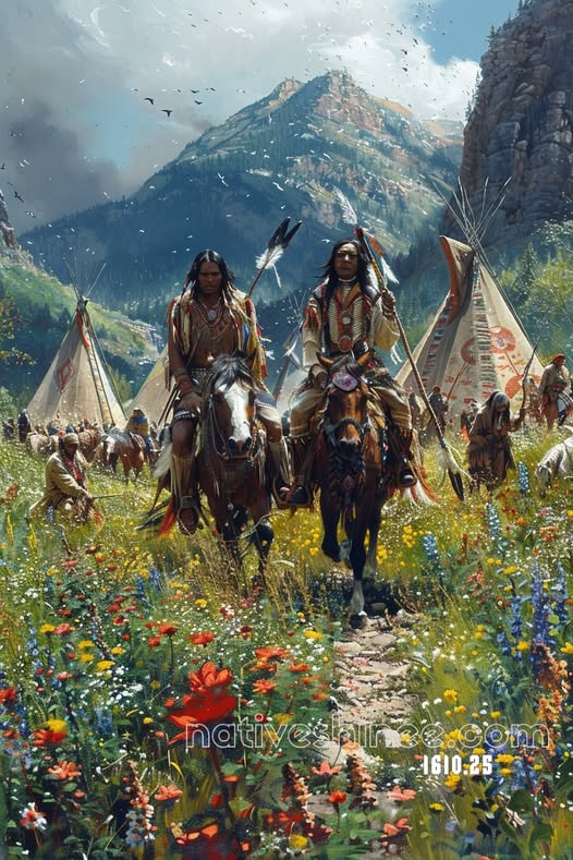 “The Path of the Braves” captures a breathtaking moment of courage and unity among Native warriors as they ride through a field of wildflowers under the vast mountain sky. Each detail— from the proud horses to the traditional attire adorned with feathers and beadwork— reflects a deep respect for nature and heritage. The mountains rise majestically in the background, symbolizing strength and resilience, while the tipi village nestled below evokes the warmth of community and belonging. The painting’s vibrant color palette brings life to the scene: the vivid reds and yellows of the flowers contrast with the earthy tones of the riders’ garments, creating a perfect harmony between humanity and the land. This canvas embodies the spirit of honor, leadership, and harmony with nature — a tribute to the timeless traditions of the Native people and their enduring connection to the Earth. Perfect for adding depth, history, and natural beauty to any space.